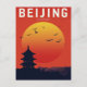 Capture the dramatic beauty of the Chinese capital with this bold, graphic travel postcard for Beijing, China. The striking illustration features the silhouette of a traditional Chinese temple or pagoda set against a massive, glowing orange and red sunset. Birds fly across the sky, adding dynamic movement to the landscape. This card is perfect for those who love Asian travel, dramatic color palettes, or collecting retro-style posters celebrating the iconic landmarks of China.