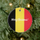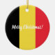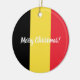 Personalised Belgian flag Christmas tree ornament. Custom Merry X-mas Holiday decorations in round or heart shape. Country flag of Belgium design. Novelty xmas decor for friends, family, kids, co worker, employee, boss, children, wedding couple, newly weds, mum and dad, grandparents, relatives, baby etc. Add your own season's greeting and photo on the back optionally. Elegant script typography template. Gold glittery string included. Create your own keepsake for 1st Christmas together or other occasions.