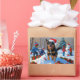 A heartwarming holiday illustration featuring a cheerful dog playing in the snow, wearing a Santa hat and surrounded by colourful gift boxes. In the background, children build a snowman beside a snow-covered Christmas tree, creating a joyful winter wonderland. Perfect for spreading holiday cheer and capturing the magic of Christmas.