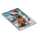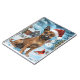 his festive design captures the joyful spirit of the holiday season, featuring an adorable pup wearing a Santa hat. The dog is nestled in a winter wonderland, complete with a snowman, a decorated Christmas tree, and beautifully wrapped presents. Snowflakes gently fall, adding a magical touch to the scene, while the vibrant colours of the holiday decorations create a warm and cheerful atmosphere.
