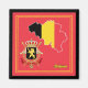 The national flag of Belgium is infused into an outline map of the country. The country`s coat of arms is also included and both are on a background of red with yellow frames to complete the design.