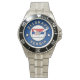 Has heft and feel of expensive stainless steel quartz watches. Good band with safety catch. I removed links, which is easy because engraved arrows show direction to push the linking pins. As always by this seller, the image (a railroad logo) is a perfect reproduction of my emailed image, and is precisely spaced and aligned.