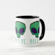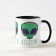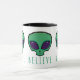 Cartoon alien head illustration with big dark eyes with "Believe" lettering.
