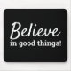 Affirmation and motivational quote, "Believe in Good Things!" This inspirational typography design features positive words of wisdom to live by daily. Design features calligraphy and script typography on a solid black background. Font is in white . Colour of font can be easily customised in the Zazzle design tool section. Other designs available.