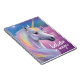 This enchanting notebook cover features the bust of a sparkly white and purple unicorn with pastel rainbow mane set against a cosmic sky of purple and teal clouds, sparkling star clusters, and a dreamy aurora-inspired atmosphere. Below the unicorn’s head floats the words “believe in magic,” in elegant white script.