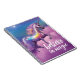 This enchanting notebook cover features a rainbow glitter unicorn set against a cosmic sky of purple and teal clouds, sparkling star clusters, and a dreamy aurora-inspired atmosphere. Below the unicorn’s feet float the words “believe in magic,” in elegant white script.