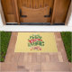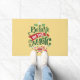 A doormat with a cool illustration. Text says Believe in the Magic in fancy lettering. Decorated with christmas balls.