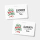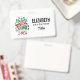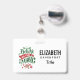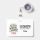 A name tag with a cool illustration. Text says Believe in the Magic in fancy lettering. Decorated with christmas balls.