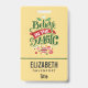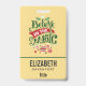 Personalised name badge with a cool illustration. Text says Believe in the Magic in fancy lettering. Decorated with christmas balls.