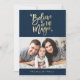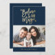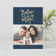 Share the magic of Christmas by sending your loved ones a modern holiday photo card. This stylish holiday card features faux gold foil text that says "Believe In the Magic", navy background with light blue dots, and placeholder for your custom photo and text.