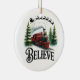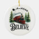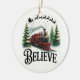 A festive Christmas illustration featuring a vintage red train steaming through snowy pine trees. Above, Santa’s sleigh and reindeer soar across the night sky, while the word “BELIEVE” reminds us to keep the magic of Christmas alive.