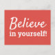 Motivational, inspiration quote, "Believe in yourself!." This is an inspirational postcard featuring words of wisdom to live by daily. Design has white font on a bright red background. Colours of both font and background can be easily customised in the Zazzle design tool section. Other designs available.