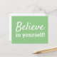 Motivational, inspirational quote, "Believe in yourself!." This is a postcard featuring words of wisdom to live by daily. Design has white font on a delicate green background. Colours of both font and background can be easily customised in the Zazzle design tool section. Other designs available.