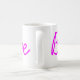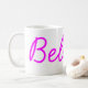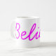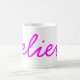 Big magenta script "Believe" mug, motivation, inspiration, beauty. Magenta is a colour of balance, harmonising pure red (Yang, passion, fire, activity) with true blue (yin, subconscious, mind, dreams). Believe. Happy blessings from Happy Wishing Well dot com.