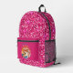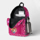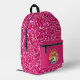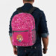 A magical design featuring a unicorn with the words Believe over it with a faux pink glitter background over the main part of the backpack.