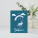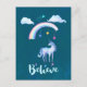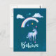 A postcard with a cute illustration. A watercolor unicorn standing under a rainbow with fluffy clouds and dangling stars. Typography says Believe. Set on a dark blue green backdrop.
