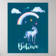 A poster with a cute illustration. A watercolor unicorn standing under a rainbow with fluffy clouds and dangling stars. Typography says Believe. Set on a dark blue green background.