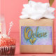 Inspirational word "Believe" is a golden yellow with matching yellow and orange hearts below the word. A pale blue background outlines the letters. The edges of the painting are in lavender and magenta colour washes. A light layer of glitter adds contrast and character to the painting.