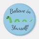 Cute and motivational little Nessie (Loch Ness Monster) cartoon telling you to "Believe in Yourself". Light green dragon-like cheerful monster with large eyes and smile, swimming in light blue water. Script is customisable. Souvenir of Scotland. Design by Letizia Morley.