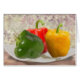 Bell peppers in green, yellow and red sit on a white plate ready to be cooked. The original is a miniature oil painting by Kathie Miller