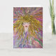 A very colorful contemporary greeting card with a lovely woman centered, eyes closed and flowing hair. Is she meditating, thinking, sleeping? This whimsical images lets the giver and the receiver of the card create their own story. An imaginative whimsical image replicated from an original painting aptly named "Bella." She has been replicated on many forms, most popularly on ladies T-Shirts.