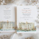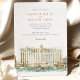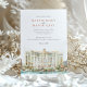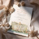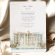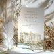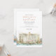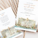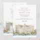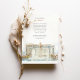Invite your guests to a spectacular celebration with this elegant watercolor wedding invitation, featuring the iconic Bellagio Hotel & Casino in Las Vegas. The artwork beautifully captures the grandeur of the resort, with its distinctive cream, beige, and light ochre facade, reddish-brown/terracotta lower level accents, and hints of blue-green in the window and roof details. The famous Fountains of Bellagio are depicted in full display with white plumes of water, all reflected in the serene foreground lake. The scene is gracefully framed by lush green trees and bushes, as well as stylised leafy sprigs in shades of green and golden-yellow/light brown, suggesting an autumnal touch. Rendered in a soft, luxurious watercolor style, this invitation is perfect for a glamourous Las Vegas wedding, a sophisticated destination event, or for couples who love iconic luxury. The front elegantly presents your wedding details, while the reverse side offers "The Finer Details" for guest information.