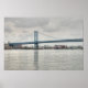 This is the Ben Franklin Bridge, which joins the cities of Philadelphia, Pennsylvania, and Camden, New Jersey. Its reflection can be seen in the Delaware River. This photo was taken from the Camden waterfront, looking towards Philly.