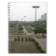 The image features a vast, symmetrical park filled with neatly trimmed hedges, paved walkways, and towering green lampposts. The layout is well-structured, with intersecting pathways leading towards a central vanishing point, creating a sense of depth and perspective. A few visitors are scattered across the landscape, adding a lively touch to the serene scene.