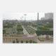 The image features a vast, symmetrical park filled with neatly trimmed hedges, paved walkways, and towering green lampposts. The layout is well-structured, with intersecting pathways leading towards a central vanishing point, creating a sense of depth and perspective. A few visitors are scattered across the landscape, adding a lively touch to the serene scene.