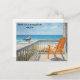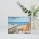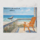 This postcard captures the beauty of a bench on a beach, with a bird perched on the railing and the sun shining in the background.