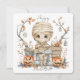 A wide-eyed mummy wrapped in soft beige bandages sits on a stone bench, surrounded by smiling jack-o’-lanterns, leafless trees, and hanging lanterns. A ghost decoration floats nearby, while wrapped gift boxes, scattered autumn leaves, and a delicate spider web complete the scene. The muted palette of oranges, browns, and greys adds cosy charm to this whimsical Halloween moment, blending spooky sweetness with seasonal serenity.