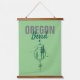 Modern wall tapestry features Oregon in distressed grey font with Bend in a modern aqua script font with geometric trees and planets logo style graphic on green background