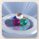 A 3D picture created in Vue, full of reflections and lights shining from all directions. Five colourful spheres of blue, pink, turquoise, orange, and diamond glass stand in a pyramid encircled by a translucent white ring. They sit on a mind-bending background of pale blue and white rays that converge right under the five crystal balls.