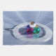 A 3D picture created in Vue, full of reflections and lights shining from all directions. Five colourful spheres of blue, pink, turquoise, orange, and diamond glass stand in a pyramid encircled by a translucent white ring. They sit on a mind-bending background of pale blue and white rays that converge right under the five crystal balls.