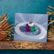 A 3D picture created in Vue, full of reflections and lights shining from all directions. Five colourful spheres of blue, pink, turquoise, orange, and diamond glass stand in a pyramid encircled by a translucent white ring. They sit on a mind-bending background of pale blue and white rays that converge right under the five crystal balls.