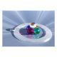 A 3D picture created in Vue, full of reflections and lights shining from all directions. Five colourful spheres of blue, pink, turquoise, orange, and diamond glass stand in a pyramid encircled by a translucent white ring. They sit on a mind-bending background of pale blue and white rays that converge right under the five crystal balls.