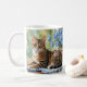 Enjoy your favourite hot drinks with a touch of feline grace. This attractive ceramic mug features a captivating Bengal cat, pictured in a watercolor style, showcasing its distinctive spotted coat and mesmerising blue eyes. The picture, displayed on both sides of the mug, depicts the elegant cat relaxing by a window, in front of a vase of blue flowers. A delightful gift for lovers of the Bengal cat breed, the mug is a stylish addition to any kitchen or home office.