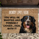 Custom Bernese Mountain Dog doormat with a funny quote. "You will be sniffed and possibly licked...Deal with it." It has a non-slip rubber that won't crack or buckle, resists fading, mould, and mildew and can be easily cleaned with a hose. Be creative - click on CUSTOMIZE to add/remove/change text, change the picture, resize the picture, change colours, background or anything else the customisation tool will allow!