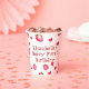 This cute "Berry First" red hearts and strawberries hand painted watercolor illustration themed paper cup with personalizable text is perfect for a 1st bday party. It features red hearts and hand-drawn strawberry motifs on a white background and text that you can customise with your own details. The template is customisable in the listing editor.