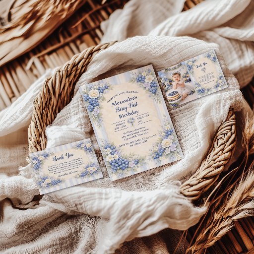 This soft blueberry garden collection features delicate florals and mixed berry details arranged in a romantic storybook frame. The airy ivory background and muted blue tones create a timeless, elegant look perfect for a Berry First celebration. Designed to feel refined yet playful, this collection works beautifully for garden parties, spring celebrations, and sweet first birthdays with a classic botanical aesthetic.