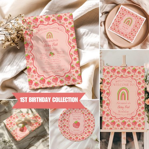 Design: Adorned with watercolor strawberries, berry motifs, and a "Berry First Birthday" slogan.