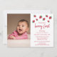 Berry sweet strawberry 1st birthday invitation with red fruit and pink polka dot background. Photo template via Pixabay licensed under CC0 and must be replaced with your own photo