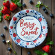 This adorable design is bursting with charm, perfect for a spring and summer baby shower vibe! The bold reds of juicy strawberries and deep blues of blueberries pop against a crisp white background, creating a fresh, playful feel and making it suitable for gender neutral baby showers. The "Berry Sweet" lettering, in a stylish brush font, adds a fun, modern twist. Surrounding the text are lush illustrations of berries and leaves, creating a nature-inspired, organic aesthetic that fits perfectly with a berry baby shower, strawberry baby shower theme or a farmers market baby shower alike.