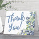 This cute thank you card features watercolor blueberries with green leaves on the front, along with the words "Thank You!" in bold handwritten script mixed with a simple font. The colours are blue and navy blue, but you can customise the fonts and background colours to fit your style.