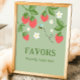 Complete your party setup with this Berry Sweet strawberry favours sign, featuring hand-drawn strawberries, white daisies, and a buzzing bee on a soft green background. This adorable strawberry party sign reads “Favours – Please Take One”—the perfect way to invite guests to grab a treat on their way out!