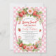 This sweet, strawberry-themed baby shower invitation features a soft pink and white gingham background that gives it a fresh, picnic-inspired feel. A white oval center provides a clean space for the event details, outlined with a subtle rosy border. At the top and bottom, lush watercolor clusters of ripe red strawberries, delicate pink blossoms, tiny berries, and leafy greenery create a charming, garden-style frame. Playful typography highlights the theme with a bold, script-style title paired with simple, modern fonts for the details, while small strawberry accents add a whimsical touch. The overall design is light, cheerful, and perfect for a spring or summer celebration.