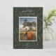 A Christmas photo card design with a seamless repeat pattern of hand drawn foliage and berries scattered. This design uses a rich and traditional colour palette of green and red hues and an elegant script and classic serif font. The back of this design has another photo placeholder and space for a personal message. This template is easily customisable, just click edit and swap the photo and information to your own.