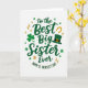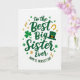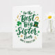 This greeting card features the message “to the Best Big Sister Ever” stacked down the center in flowing emerald-green lettering, with a soft shadow that gives the words a gentle lift 💚. A small shamrock stands in for a dot within the wording, adding a sweet little wink that feels like an inside joke between close siblings ☘️. Near the bottom, “HAPPY ST. PATRICK’S DAY” curves in smaller green text, tucked neatly under the main message. The background stays bright white, making the greens and warm gold accents stand out clearly. Around the lettering, you’ll spot a four-leaf clover, a leprechaun hat with a gold buckle, and tiny gold horseshoe and starburst details that feel like they’re sprinkled in celebration. The hat sits above the word “Sister,” like it’s been set there with an affectionate, teasing touch. Deep and lighter greens mix through the design, while the gold details glint beside the central text on the white background.