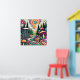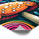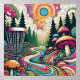A unique colourful disc golf course in a field of retro mushrooms, pine trees, colourful swirling cloud, sunshine in vintage colours like blue, green, pink and orange.