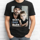 T-shirt featuring your custom photo and the text "Best dad ever" as a white and light blue overlay in the bottom left corner.